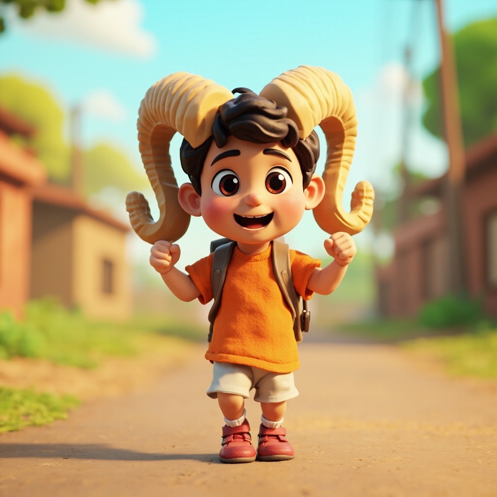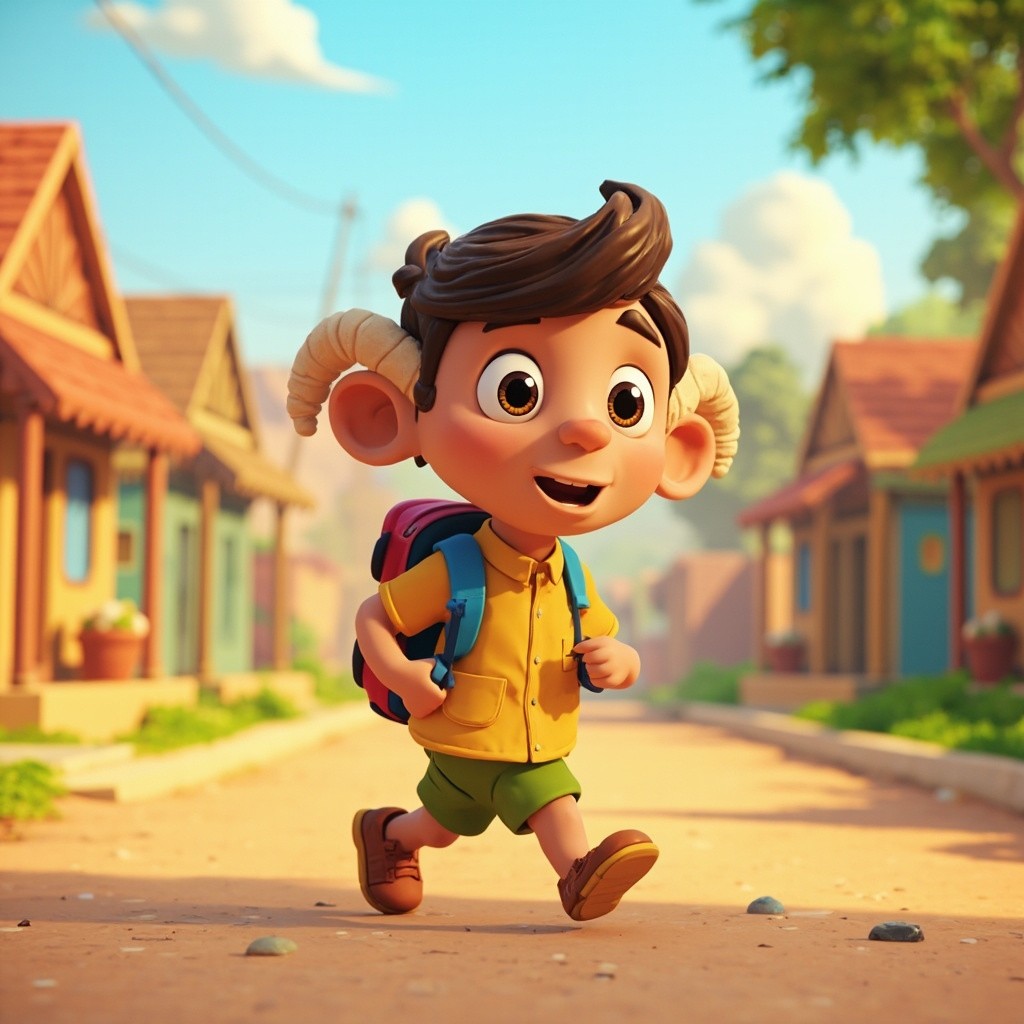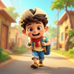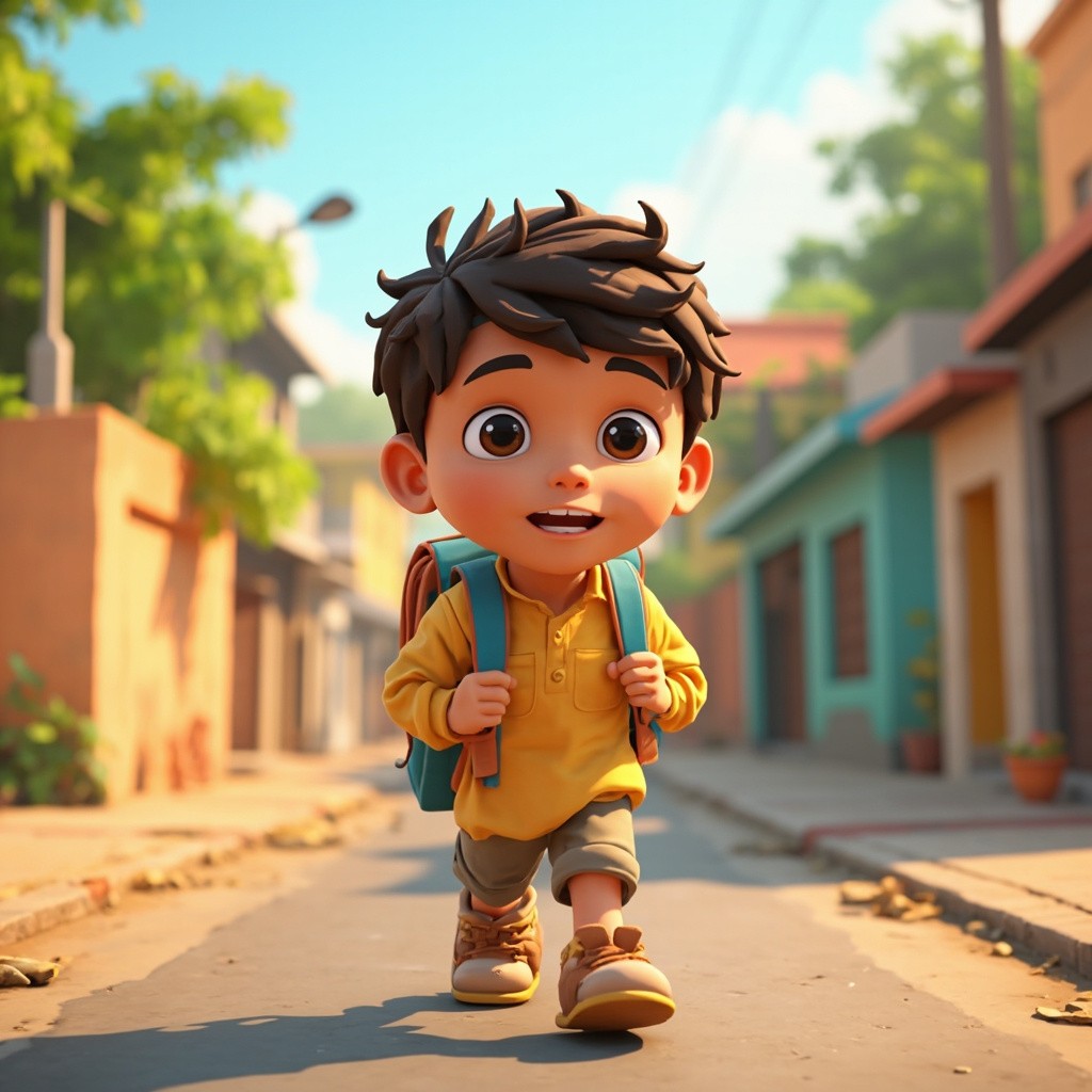 3D Cartoon Indian School Boy with Bag Walking on Village Road
