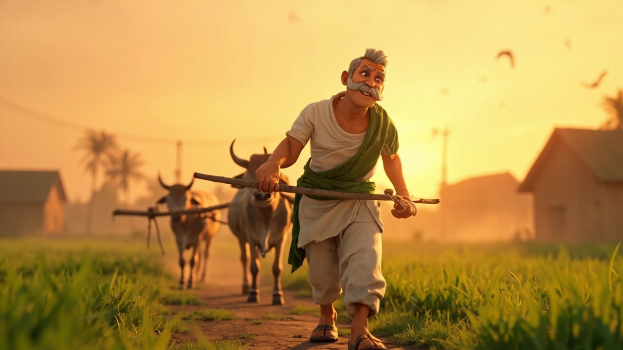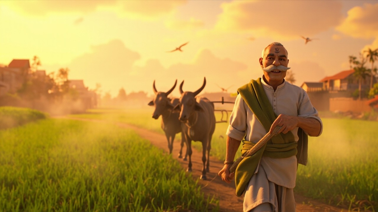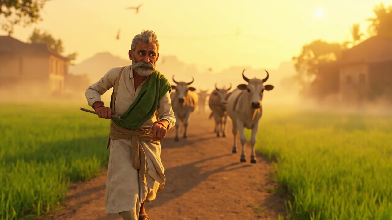 A peaceful Indian village at sunrise, Ramlaal walking toward fields with two bullocks, golden morning light, birds flying, fresh green fields, Ramlaal holding a wooden plough, gentle smile, mist in the air, rural houses in background, 3D cartoon style, cinematic wide shot, warm colors, consistent Ramlaal character A middle-aged Indian farmer named Ramlaal, slim build, average height, medium brown skin, kind and gentle facial expression, expressive warm eyes, thick grey mustache, slight wrinkles showing life experience, wearing a simple white cotton kurta and traditional dhoti, green gamcha draped over his shoulder, brown leather sandals, slightly sun-tanned skin from farm work, calm and hardworking posture, humble personality visible in expression, rural Indian look, 3D cartoon Pixar-style character, soft realistic textures, rounded facial features, detailed clothing folds, natural lighting, friendly and inspirational appearance, same face, same outfit, same proportions in every scene create a video