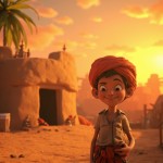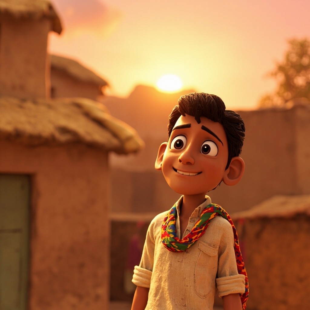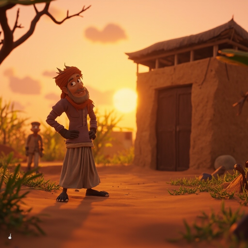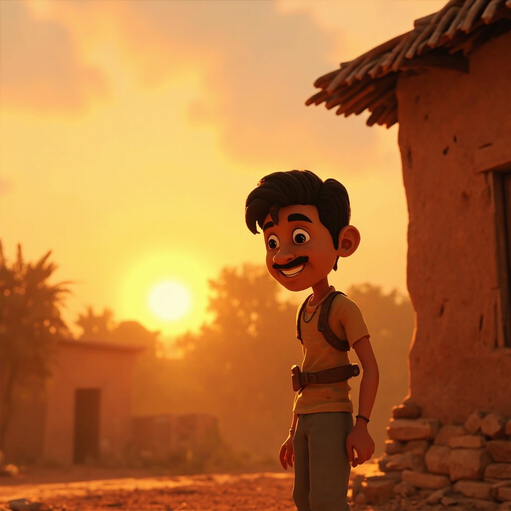 Smiling Rashid Near Mud House in Indian Village at Sunrise - 3D Cartoon