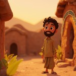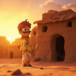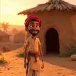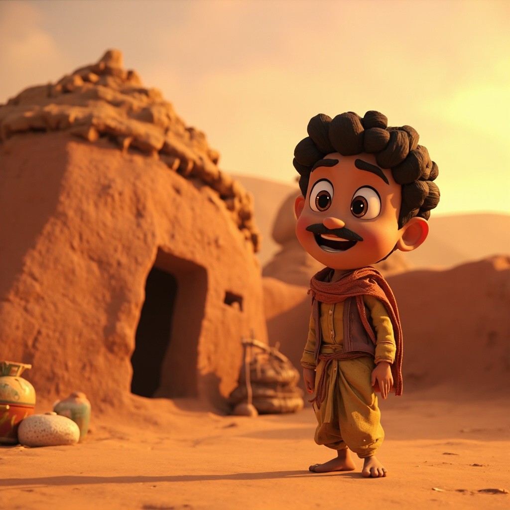 Smiling Rashid Near Mud House in Indian Village at Sunrise, 3D Cartoon