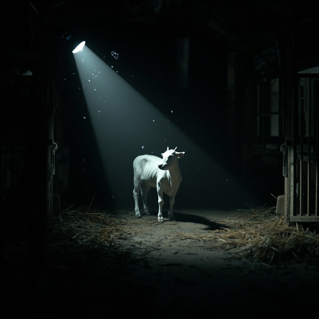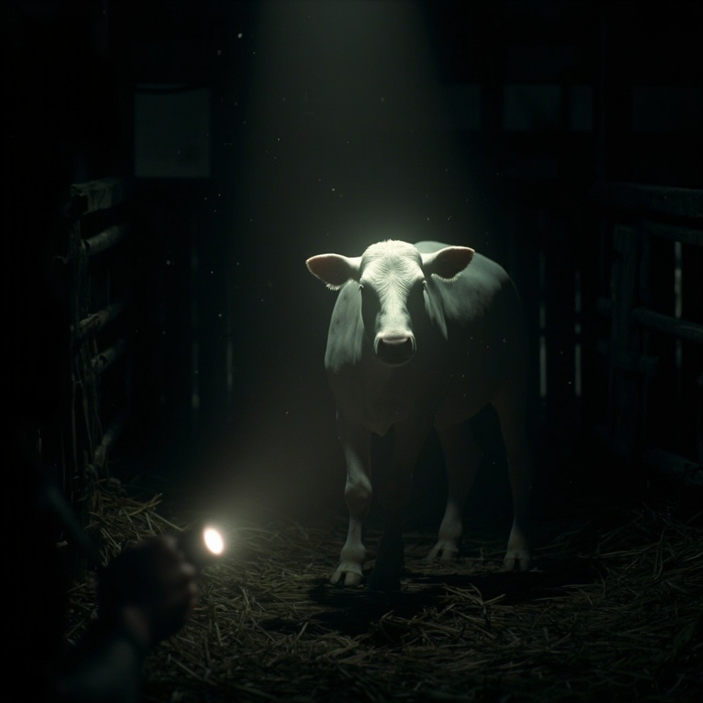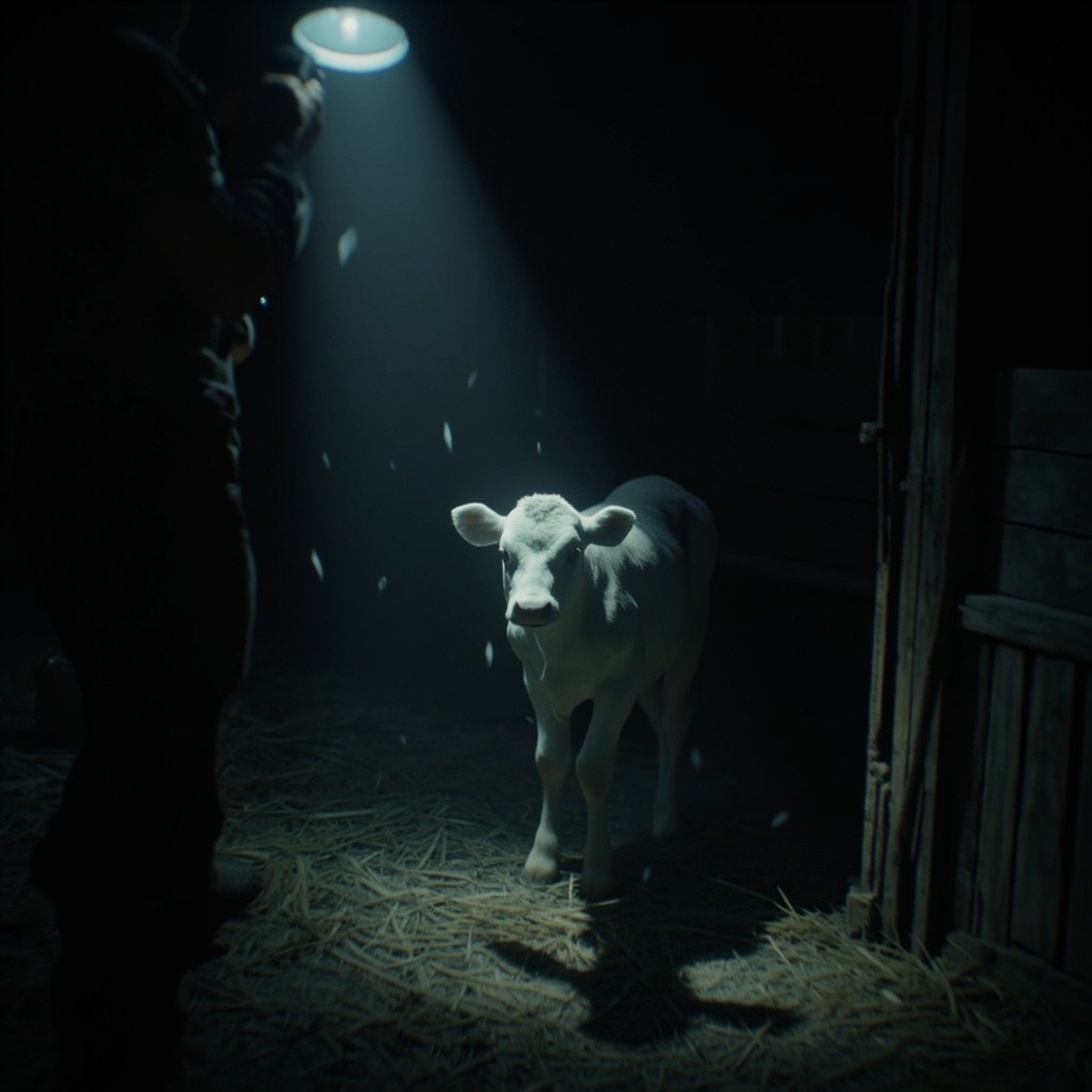 prompt": "A photorealistic, found-footage style video of a handheld camera walking slowly toward a white calf standing in a stable. The camera mimics a real human point of view with a grounded, realistic walking motion, including a subtle vertical bob and gentle side-to-side sway. A flashlight beam, held by the viewer, illuminates the scene, reacting with natural delays and small overcorrections as it scans the animal. The calf is completely still and lifeless-no breathing, no blinking, and no animation. The environment is dark with gritty textures and strong shadows, featuring floating dust particles in the air and a very subtle flicker from the flashlight. The stable remains consistent throughout the shot, with straw on the ground and wooden slats in the background. High-fidelity realism with natural camera imperfections.",