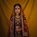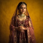 potrait of beautiful indian young rajathani maharani wearing A regal Rajasthani Maharani wearing a traditional Padavat costume, richly adorned with intricate hand-embroidered silk lehenga in deep maroon and gold, featuring heavy zardozi, gota patti, and mirror work. She wears a matching choli with detailed floral motifs and a flowing, translucent odhani draped gracefully over her head and shoulders, bordered with fine embellishments. Her jewelry includes an ornate borla (forehead ornament), kundan-studded rakhdi, heavy gold nath (nose ring), jadau choker, multilayered pearl haar, bangles, bajubandh (armlet), and kamarbandh. mid shot natural lighting muted colourtone yellow background,cinestill use 35mm sony alpha a7 camera.