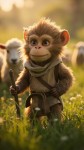 Rivo is a slightly larger monkey about the height of a small human child, with light brown fur, soft and detailed, big round expressive eyes, gentle heroic face, slightly rounded cheeks, small nose, short tail, balanced proportions, cute yet strong posture. He wears a simple rustic shepherd cloth around his waist and holds a wooden stick. Ultra realistic fur, natural colors, clean textures, consistent appearance in every frame.” Scene: Rivo guiding several realistic sheep in a green meadow, morning sunshine, balanced attractive frame.
