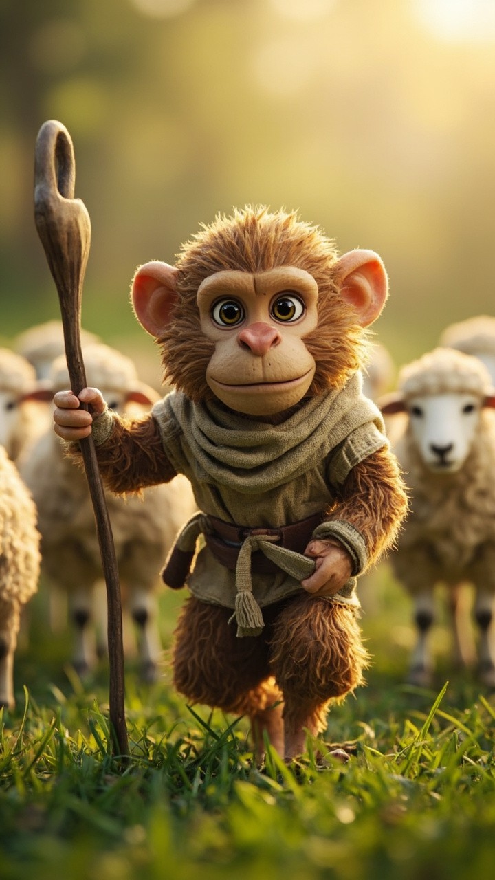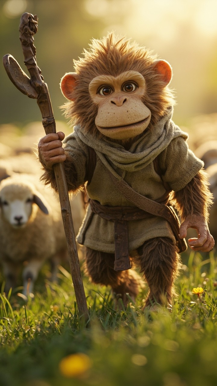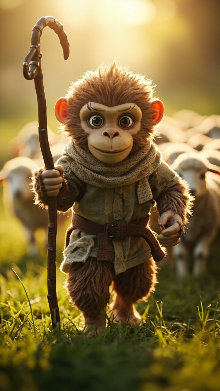 Rivo, Light Brown Fur Monkey Shepherd with Wooden Stick