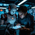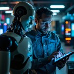 Humanoid Robot and Engineer Analyzing Code in High-Tech Lab