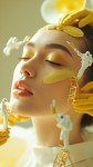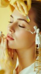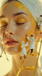 23h A surreal close-up portrait of a woman with flawless, radiant skin, her eyes gently closed, radiating tranquility. Tiny robot beauticians in pristine white lab coats carefully applied yellow skincare products to her face, as if they were skilled craftsmen creating a masterpiece. One miniature woman applies soft yellow cream to her cheeks with a small spatula, while another smooths the product with her hands. Another expert stood on a golden ladder, meticulously massaging the skin to ensure an even application. , with an emphasis on highlighting the intricate details of the scene. The lighting is soft and diffuse, creating a luminous glow on her skin while emphasizing the surreal nature of the composition. Shot with Canon EOS R5, 85mm f/1.2 lens, macro photography, soft diffused light, surreal details, soft neutral tones.
