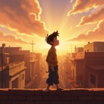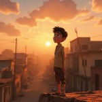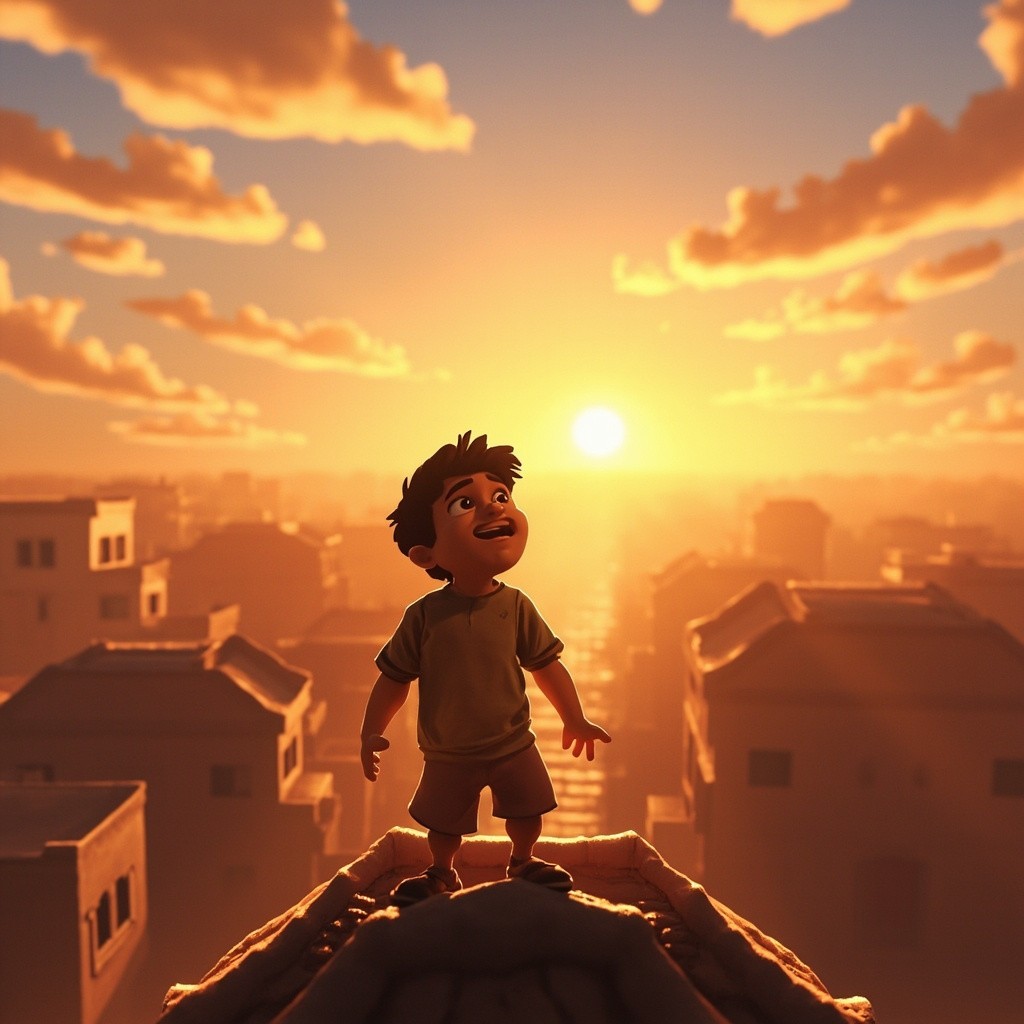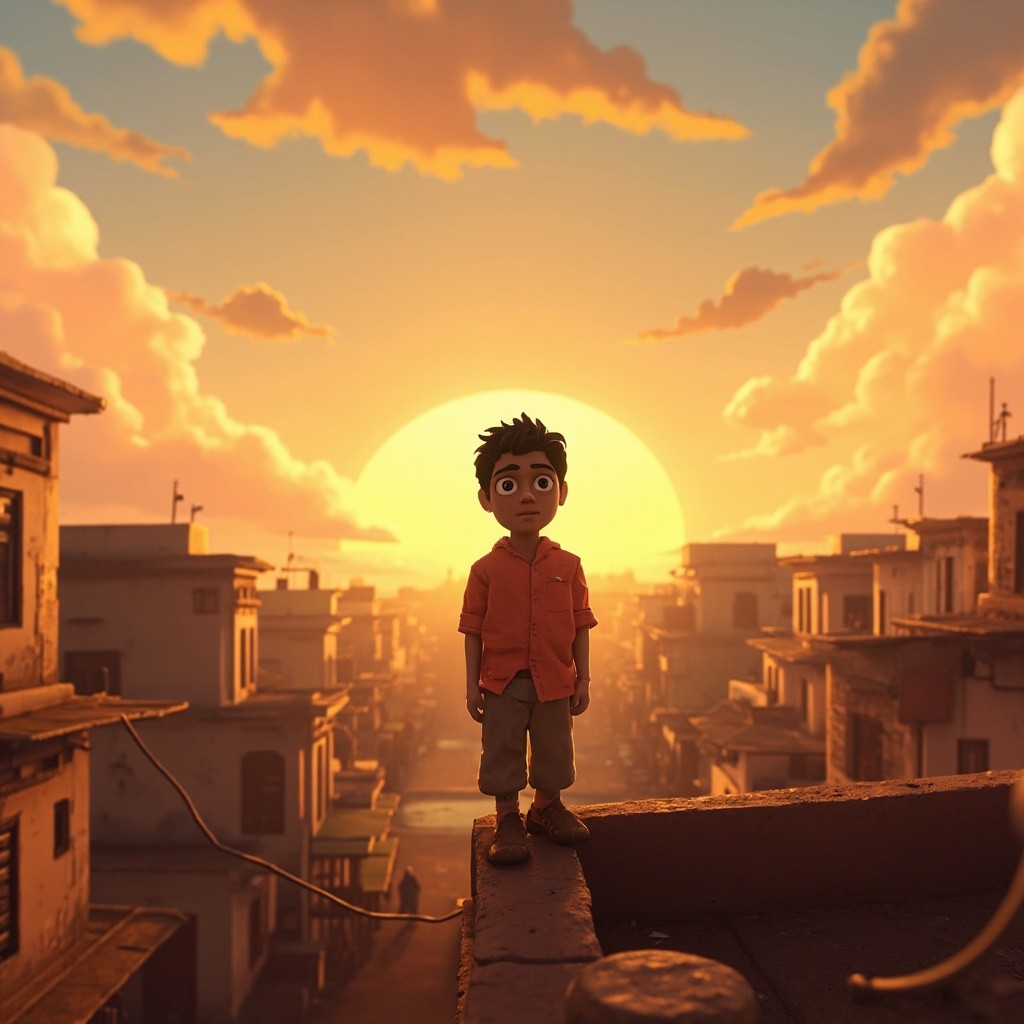 Indian Town Sunrise with Dreamy Boy on Rooftop, 2D Cartoon Animation Style