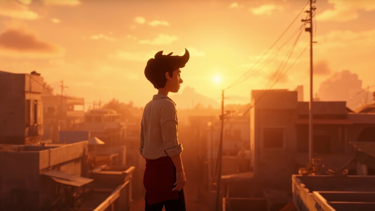 A small Indian town with simple houses and narrow streets, warm sunrise sky, Rohan standing on rooftop looking at sky with big dreams, emotional hopeful expression, cinematic composition, 2D cartoon animation style, soft cinematic lighting, high quality, ultra detailed background, professional look, smooth shading, depth of field, consistent character design, same face, same clothes