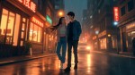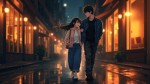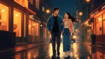 Anime-Inspired Illustration of Romantic Couple Walking on Rainy City Street at Night