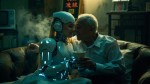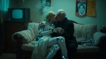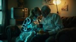 Romantic Scene with Korean Female Robot and Elderly Chinese Man in Nighttime Bedroom