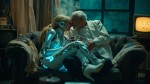 A 20-year-old Korean female robot is sitting on the sofa with a cup of steaming tea. The robot has long blond hair and exquisite makeup. Her entire body is a white cyberpunk mechanical body with metal highlights, a smile, blue glowing decorative lines, and white mechanical high heels. An 80-year-old white-haired Chinese elderly man is sitting side by side with her on the sofa and smiling. At night, the background is a simple bedroom, an old TV, a Chinese calendar, and a real photo, now they stood up and hold each other in a romantic way kissing deeply as the have fallen in love with each other