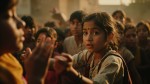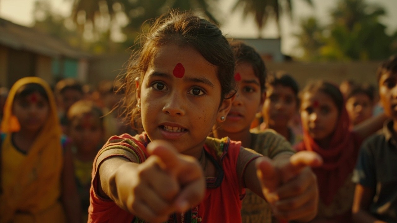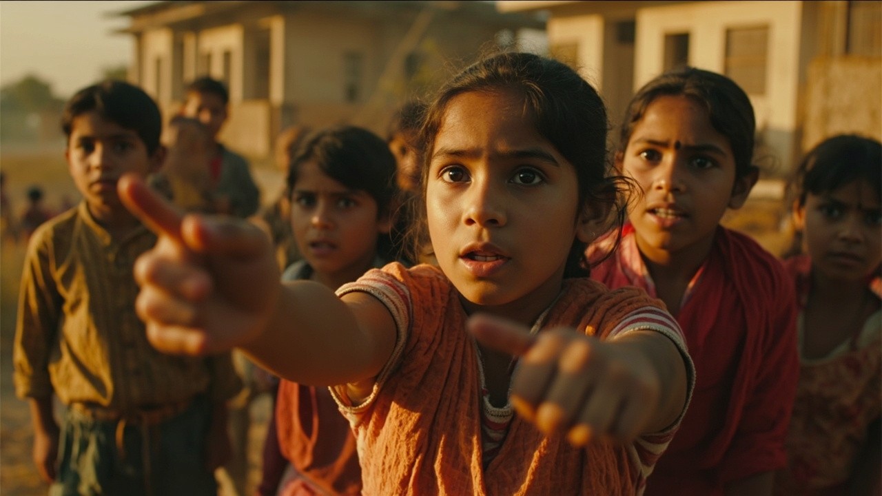 group of children in rural India planning or performing together, to their village members, expressive gestures, playful but determined, one girl, age 11 or 12 slightly leading, we see the adults watching. determined expressions, leading others forward with purpose, sense of mission. clear leadership, children following her lead, coordinated movement, sense of purpose, cinematic, golden hour, documentary realism --ar 16:9 --style raw.