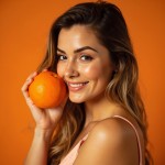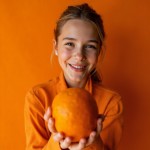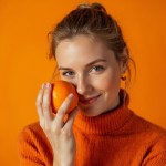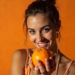 Smiling Model-Style Russian Girl Holding Orange, No Background