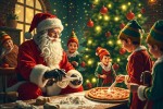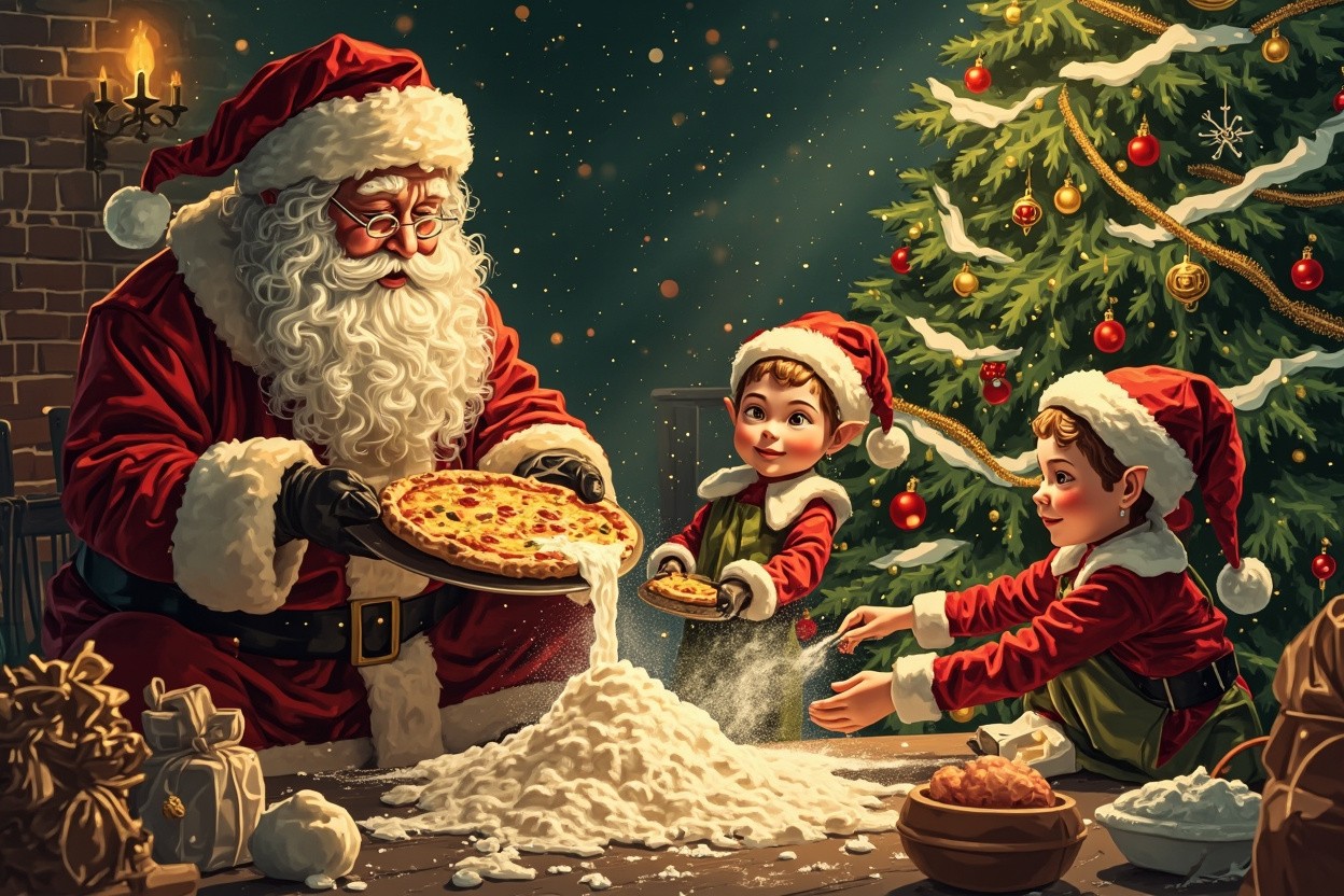 Santa Claus and Elves Decorating Christmas Tree and Making Pizza Illustration