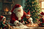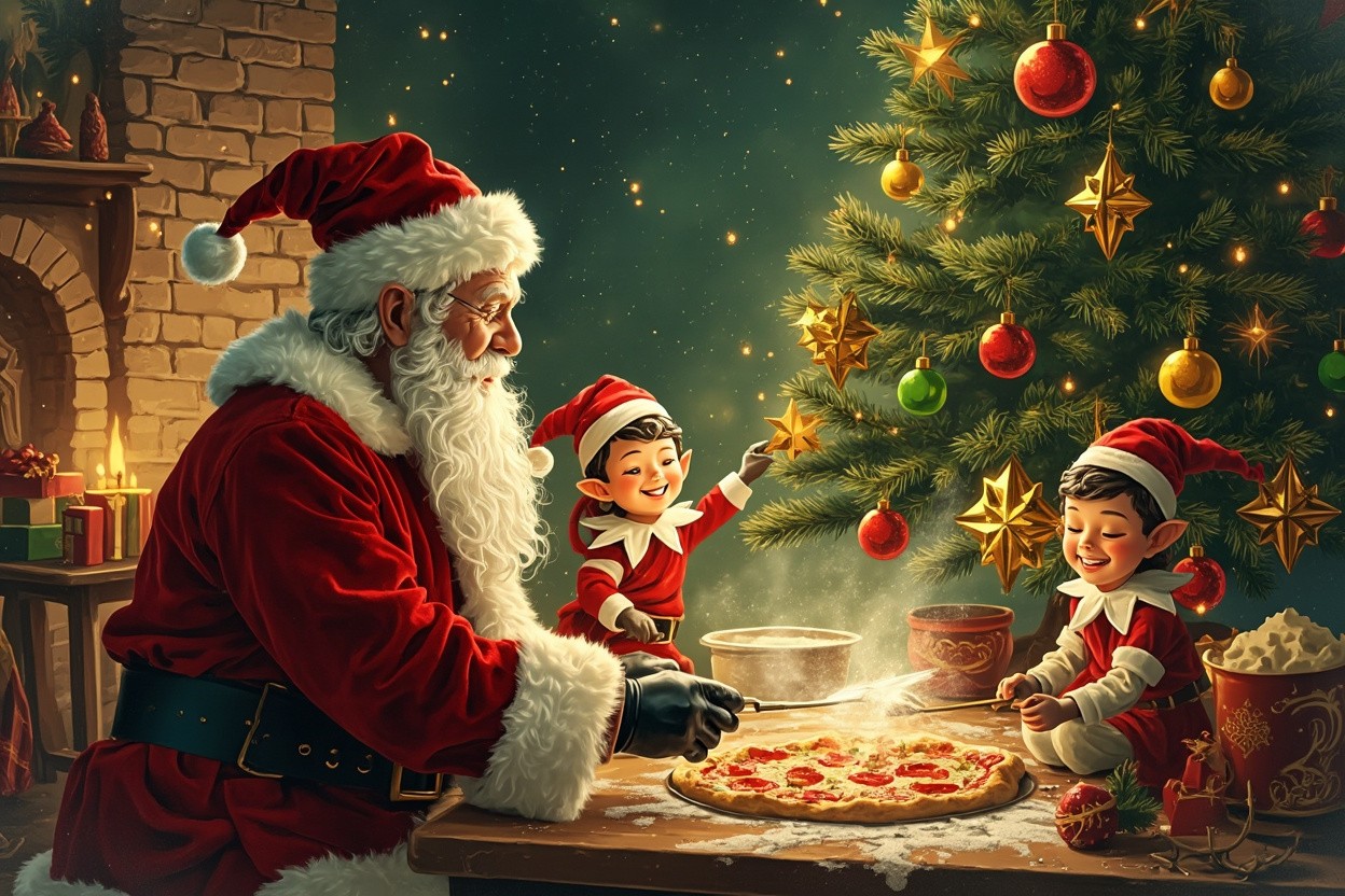 Santa Claus and Elves Decorating Christmas Tree and Cooking Pizza Illustration