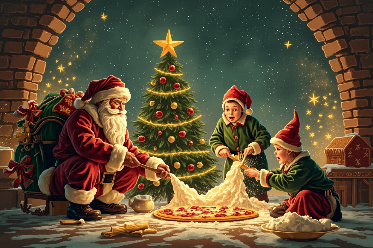 Scene of Santa Claus and Christmas elves decorating a Christmas tree while other elves cook traditional pizza or play with flour. Warm, playful yet refined atmosphere. Clear composition, readable from distance. Colors optimized for projection on brick walls: rich greens, warm whites, soft gold accents. Magical Christmas village setting, gentle lighting, soft shadows, clean outlines, high contrast, festive details. Static illustration, no motion.