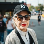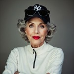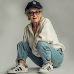 Stylish 40-Year-Old Woman with Gray Hair, Baseball Cap, Sunglasses and Track Sneakers