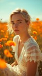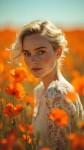 A cinematic portrait of a young woman with short blonde hair and light freckles, sitting in a vivid field of orange poppies. She wears a white lace dress with intricate patterns, looking directly into the camera with a serene, dreamy expression. The background is softly blurred, creating depth of field with warm, rich tones under a bright blue sky. The image feels sun-drenched, gentle, and painterly, emphasizing vibrant orange and white contrasts. Style: hyper-realistic, shallow focus, cinematic lighting, editorial fashion photography
