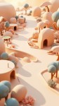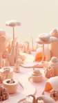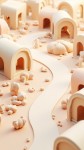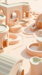 Design an image of a stylized zoo in axonometry, characterized by a serene and welcoming atmosphere. Use a palette of soft and pastel colors to create a sense of tranquility, with minimalist 3D graphics emphasizing contemporary design. Shapes should be smooth and fluid, promoting a harmonious and natural appearance. Include elements such as curvilinear paths, compact habitats for animals, and structures with modern, stylized designs. Ensure that all elements are seamlessly connected, creating a continuous and organic visual flow that extends uniformly to the edges of the image, guaranteeing a dynamic and well-balanced composition.