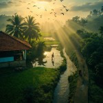 A wide top-angle drone view of a serene hillside village at sunrise, with golden sunlight breaking through mist and gentle rainfall. Birds are seen mid-flight above the landscape. Below, villagers work in lush, waterlogged paddy fields, their figures reflected in the shimmering surface. Tall coconut, arecanut, and native forest trees create a green canopy in the background. A tiled-roof house partially peeks through the trees. Small river with clear water beside the house. The terrain slopes gently, indicating the edge of a hill, and a narrow, winding rural road cuts through the landscape, slick with fresh rain. The atmosphere feels fresh, calm, and deeply connected to nature.