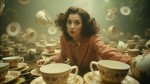 Shelley Duvall with Oversized Porcelain Tea Cups in 1970s Forest Surrealist Fashion Shoot