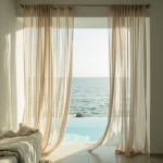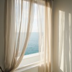 Silk Curtains Billowing in Coastal Villa with Sea Background