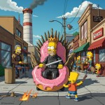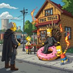 A vibrant animated scene in the classic Simpsons art style. Ned Stark, wearing a tattered Night’s Watch cloak, is seen begrudgingly clocking in at the Springfield Nuclear Power Plant. Nearby, Daenerys Targaryen in a barmaid outfit is serving drinks at Moe’s Tavern, her dragons perched lazily on barstools. In the center, Homer Simpson accidentally sits on a crude, donut-shaped Iron Throne made of pink frosted donuts, looking clueless but wearing a crooked crown. Bart skates by holding a flaming sword, and Lisa plays a medieval lute on the sidewalk. Style: cartoonish, comedic, richly detailed. Lighting: sunny Springfield afternoon with playful shadows. Mood: absurd, colorful, packed with Easter eggs