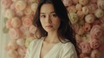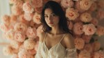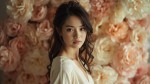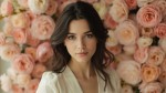 Photorealistic portrait of a skinny slavic woman with long dark hair standing against a backdrop of densely arranged soft pastel flowers. She wears a minimalist ivory top, hair loosely styled, looking into the camera with calm self-assurance. Soft light enhances her features, creating a dreamy, romantic but intelligent mood.