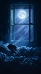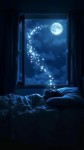 A silhouette of a person sleeping peacefully in a cozy bed. The bedroom window is open, and moonlight streams in, transforming into a gentle, flowing river of stars that surrounds the sleeper's head, washing away the day's stress. The atmosphere is tranquil and magical. Style: Dreamlike, ethereal, magical realism, with a color palette of deep blues, purples, and silver.
