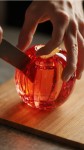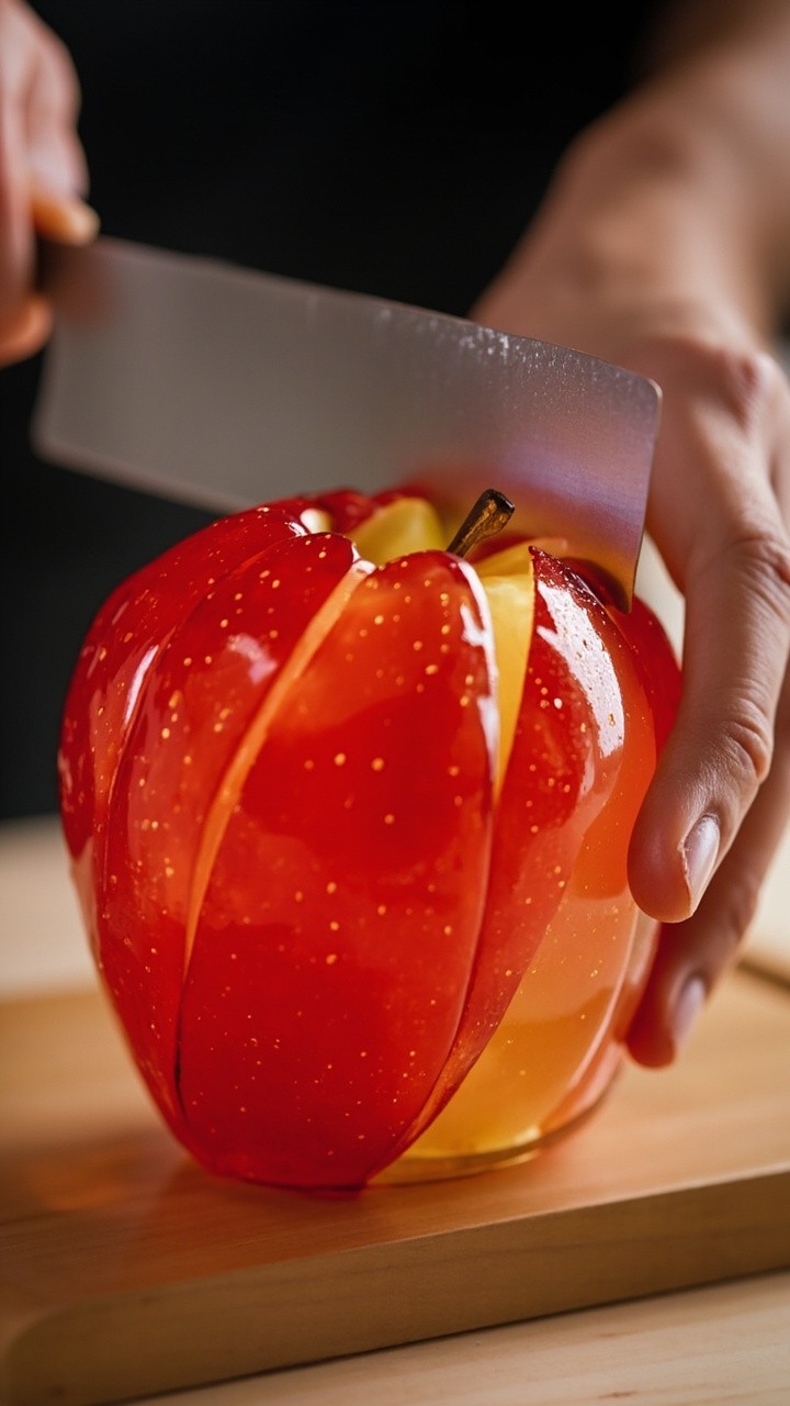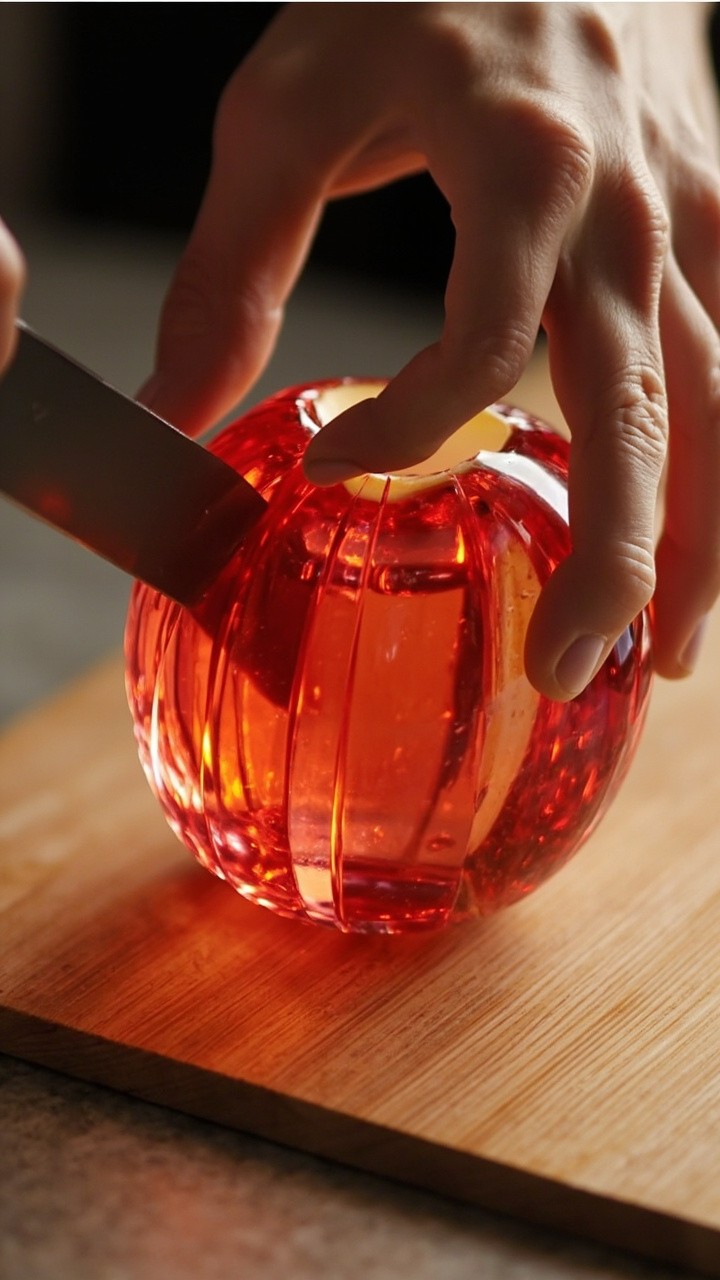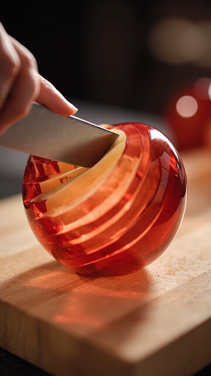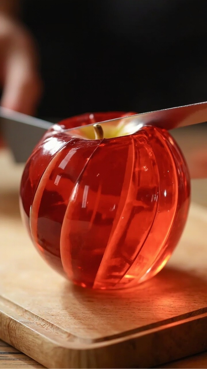 A close-up of a hand holding a knifeslicing an apple that looks liketransparent glass on a wooden board. Anapple made of glass that is extremely realistic and beautiful, resembling a translucent red crystal, is placed on a clean wooden cutting board. The knifesmoothly slices through the fruit, creating thin, transparent slices. The sound of the knife cutting through the glass-like fruit is amplified, creating a retreshing ASMRsound. This ASMR video exudes a sense ofluxury and elegance, high