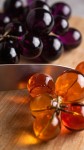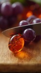 A detailed image of a semi-translucent orange glass fruit, with visible glassy segments inside, being sliced by a sharp blade. The scene is "A cluster of small, deep purple glass grapes lying on a wooden cutting board, with a steel knife gently slicing through one grape. Each grape is glossy and refractive like crystal beads. The lighting is soft and highlights the curves and clarity of the glass. The background is blurred to keep focus on the cutting action. ASMR-inspired, macro photography style