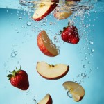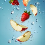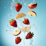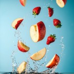 Slow-Motion Apple and Strawberry Toss on Blue Background