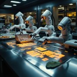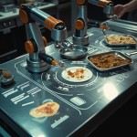 Smart Kitchen with Robotic Arms Preparing Food, High-Angle View