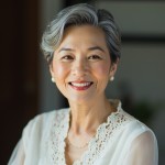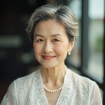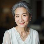 Refined East Asian Woman with Silver-Gray Hair and White Blouse in Natural Lighting, Indoor Portrait