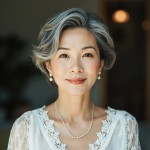 A refined middle-aged East Asian woman with short, softly layered silver-gray hair, neatly styled with natural volume. She has a smooth, fair complexion, heart-shaped face, and gentle almond-shaped eyes. Her eyebrows are well-groomed, lips naturally full with a warm smile, and she wears subtle, elegant makeup. She’s dressed in a white blouse with intricate lace trim, semi-sheer sleeves, and delicate pearl jewelry. Natural lighting enhances the glow of her skin and hair texture. Upper-body portrait, indoor background, soft and serene expression, realistic photo style.