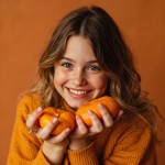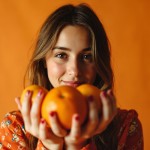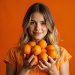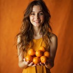 Smiling Russian Model Holding Oranges, Orange Shades Background