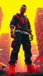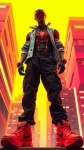 Full-body front view of a futuristic, urban Spider-Man character with a black and red suit featuring web patterns, wearing oversized neon-red Nike sneakers, cargo pants, and a loose, light-blue shirt over the suit. He stands confidently on a rooftop, surrounded by tall cyberpunk buildings in vibrant shades of orange, pink, and red. The sky is a solid bright yellow. The character wears round orange-tinted glasses and a red digital wristwatch. Neon lighting, streetwear style, urban sci-fi vibes, low angle shot, ultra-detailed, cinematic look.