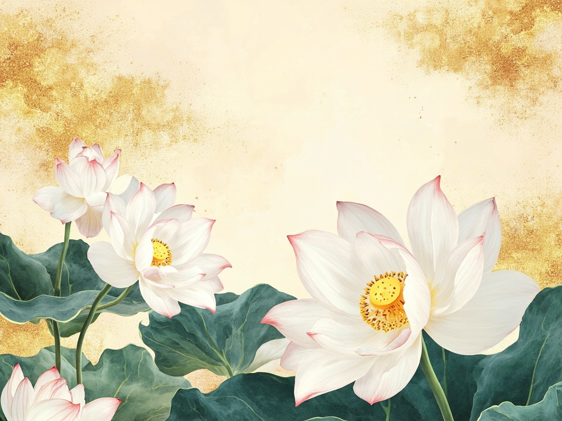 Spring floral in watercolor vector background. Luxury wallpaper design with white lotus flowers, line art, golden texture. Elegant gold blossom flowers illustration suitable for fabric, prints, cover. illu, photography, ultra-realistic, modern aesthetic, clean design, vibrant colors, bright lighting, high contrast, natural environment, realistic textures, sharp focus, professional DSLR, 35mm lens, stock photo style, 8k, photorealism, no vintage, no retro, no antique, no old-fashioned, avoid grunge, avoid patina
