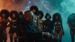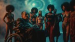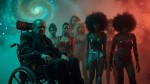 Steven hawking, sitting in a wheelchair. He is fully in frame to the left of the image, with a swirl galaxy in the background. He is surrounded by beautiful black women of all shapes and sizes from a hip hop music video, dressed in costumes like a 80s science fiction movie. Smokey atmosphere, contrasting colours, intense light, Afro, Music video, hip hop music, Photo real, photoshoot. Contrast, details.