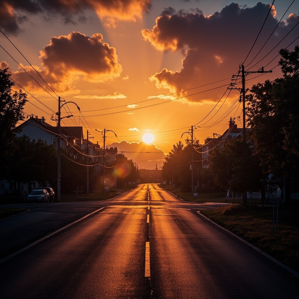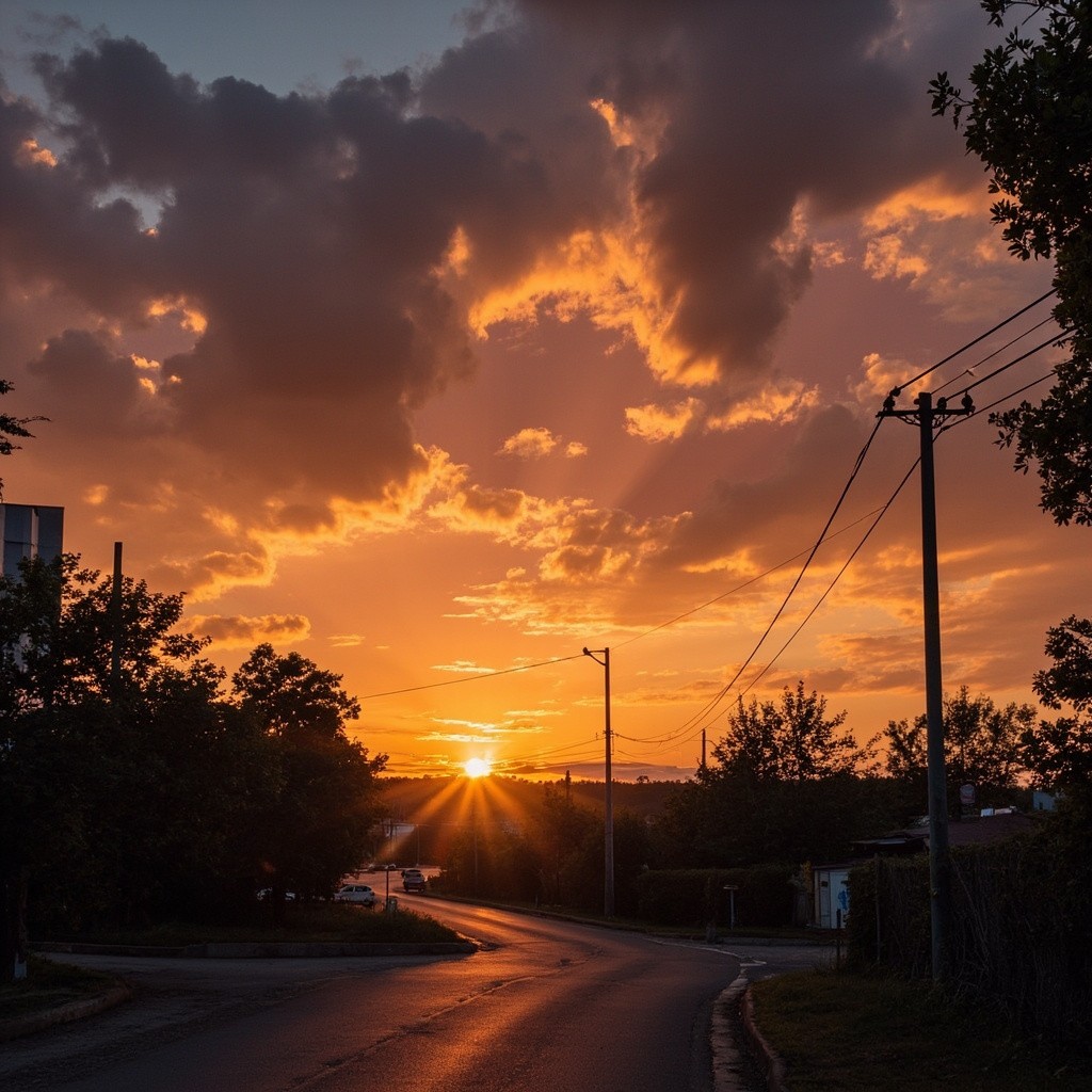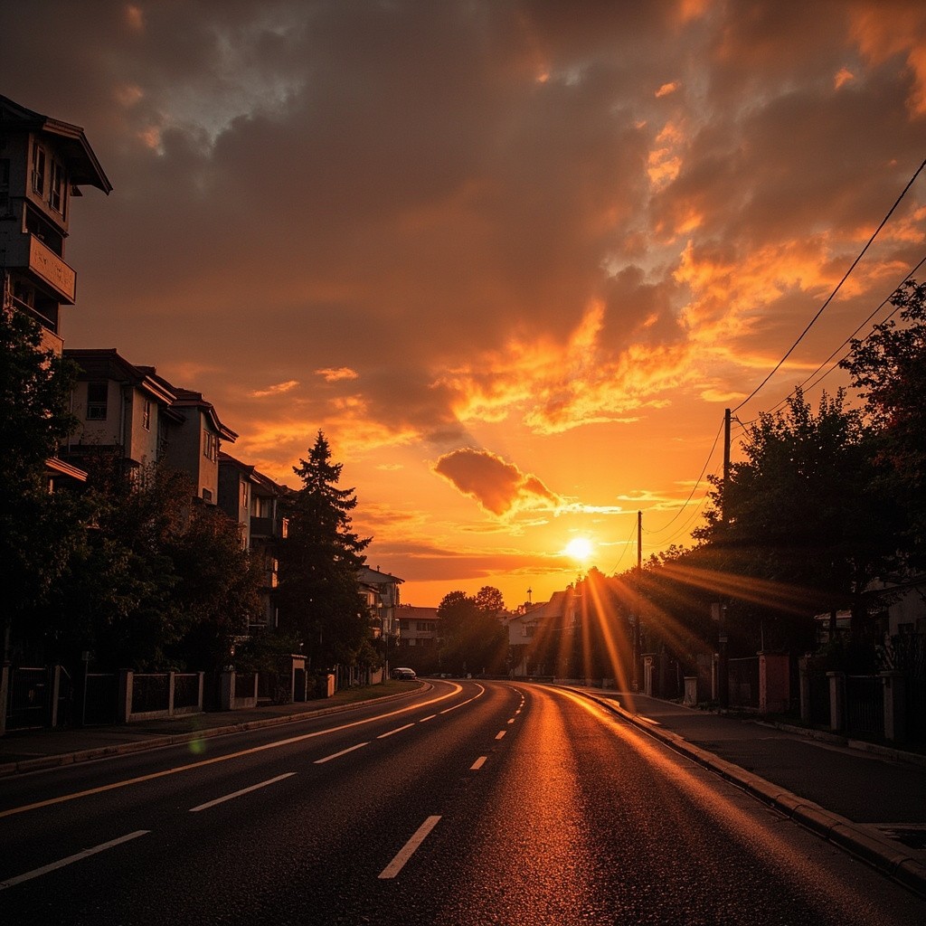 Transform this image into a dramatic sunset HDR style while preserving 100% of the original content. Do NOT change, add, remove, replace, or distort any object, subject, animal, person, building, tree, road, shadow, reflection, or background. Maintain the exact same: composition framing perspective w.compcation.foming camera angle subject positions shapes and proportions Colors must look realistic, not oversaturated, not artificial. No fantasy effects, no extra clouds, no extra sun, no lens flares, no fog, no rain unless already present. This is a strict color and lighting transformation only. Photorealistic sunset HDR edit. Original image must remain perfectly recognizable