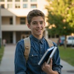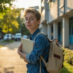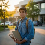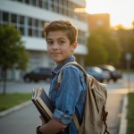 A young male student stands with his back to the camera, holding two books in his left hand. He wears a blue denim shirt and has a beige backpack with leather straps. The scene is set outside a modern school building, illuminated by warm sunlight during late afternoon. The path in front of him is paved, and there are green trees and parked vehicles in the background.