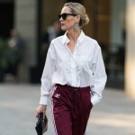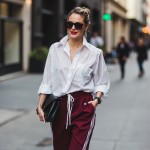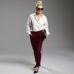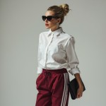 create a women 40 years old who is stylish with hair in a twist knot. she is wearing sunglasses and make up and lipstick. she is wearing a white button-down shirt partially tucked into Adidas maroon track pant with 3 stripes down side leg. she is wearing pointy toe pumps and a black clutch leather bag. silver thick earrings.