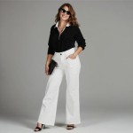Stylish 40-Year-Old Woman in White Denim and Black Top with Clutch