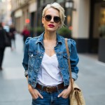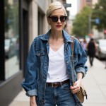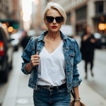 create a woman over 30 with short blond hair red lipstick. She is thin and fit and wearing a crew neck tee shirt in white under a denim jacket with puff sleeves and worn open over a white V-neck tee shirt over her belted jeans. t. She is wearing fitted straight jeans and sandals and straw bag and sun glasses. show her head to toe in city setting.