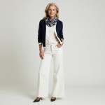 Stylish 50-Year-Old Woman Wearing White Jeans and Navy Cardigan with Printed Scarf