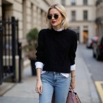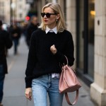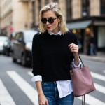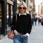 Create an influencer over the age of 35. She is blonde, red lipstick, pretty and fit. Hair is shoulder length. She is wearing sunglasses. she is carrying a Hermes Bucket Bag -- Picotin Bag in Color "Fauve". She is wearing a black crewneck sweater over a white shirt that is peeking out at the hem. Her jeans are medium was fitted boot cut with high heel sandals. She is in a city setting. Show head to toe image.