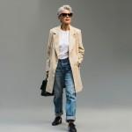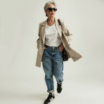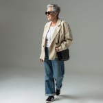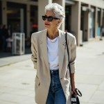 Stylish 40-Year-Old Woman with Short Gray Hair and Accessorized Outfit