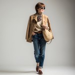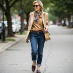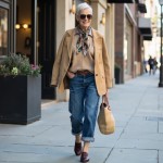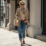 Imagine a 40 year old woman who is highly stylish wearing: medium was denim barrel jeans that reach to her ankle. She is wearing a brown belt at waist. Her shoes are oxblood loafers. She is not wearing socks. she is wearing a light tan polo collar sweater and a light tan blazer worn open that ends at her low hip. around her neck is a small printed scarf tied. she is wearing sunglasses and carrying a straw bag.