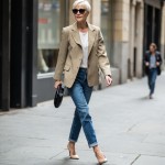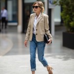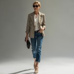 Imagine a 40-year-old woman who is highly stylish and very pretty. Hair is short. she is wearing straight slim jeans to the ankle. Wash is medium wash denim. She is wearing a light khaki collarless blazer buttoned up. She is carrying a black clutch bag. She is wearing dark sunglasses and high heel beige sandals.