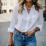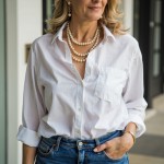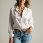 create a 40 year old stylish woman who is size 18 and an apple shape--she has a full mid section. She should be wearing a crisp white button down shirt with flared leg jeans and a belt. give her layers of pearls and chunky gold necklaces. No earrings. shoes should be tan pointed toe mules with open back. make this a close up shot from waist up.